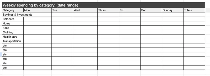 Creating categories can be as detailed or simple as you like. You'll start with daily record-keeping, translate that into a weekly chart and finally, analyze your weekly spending by category.